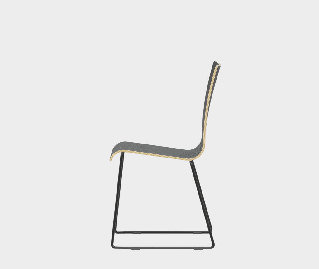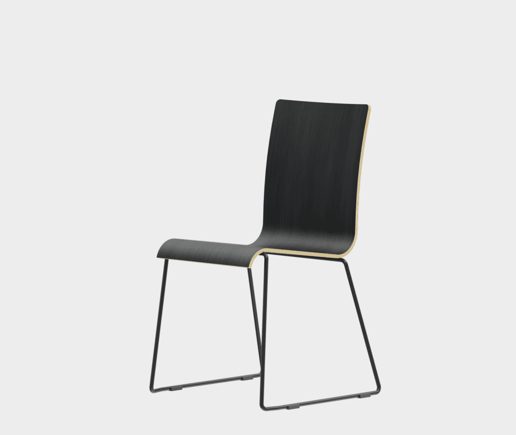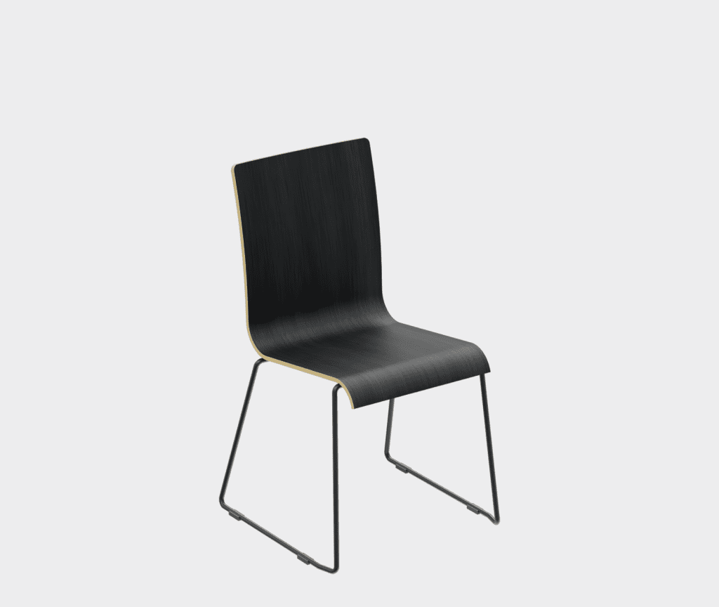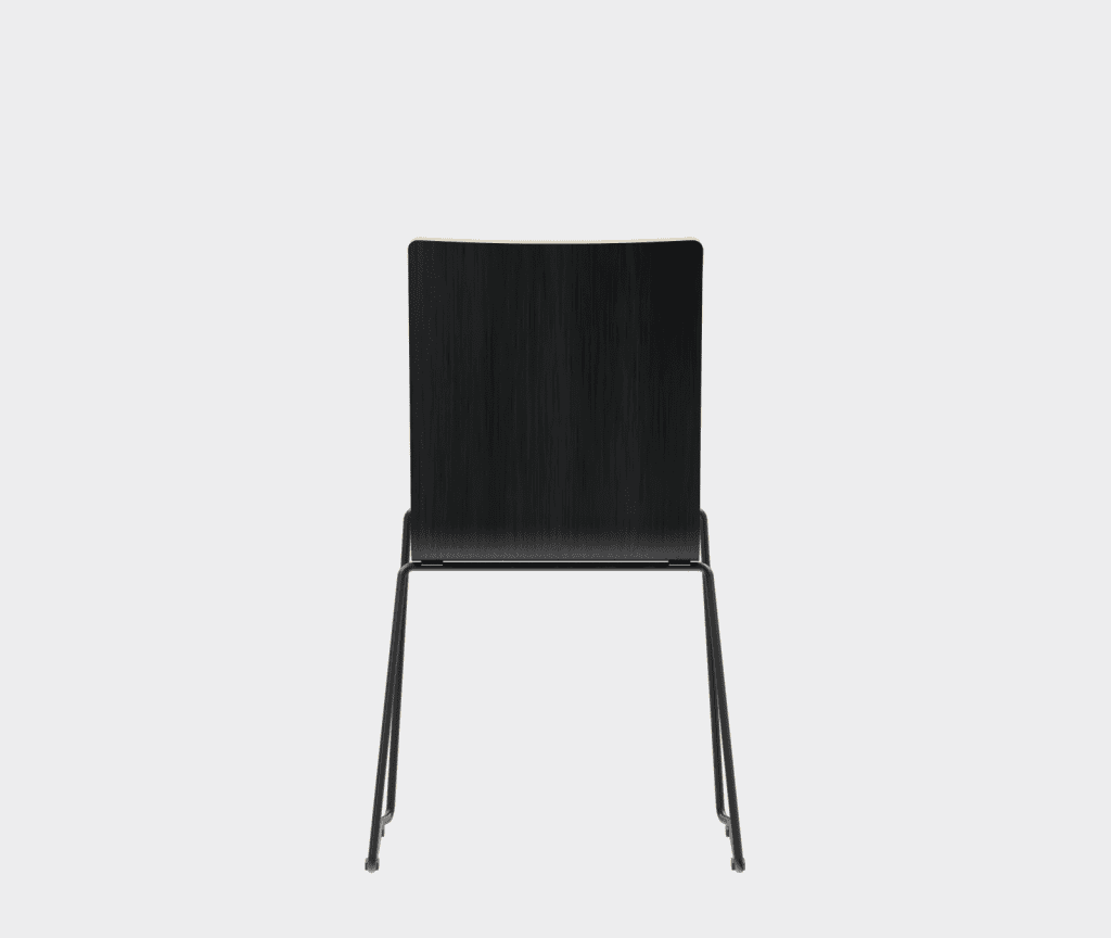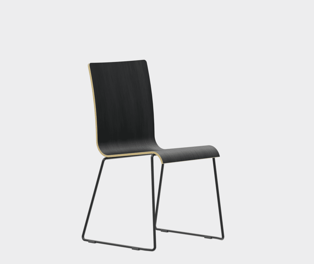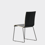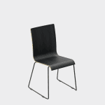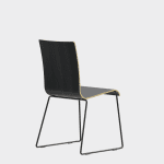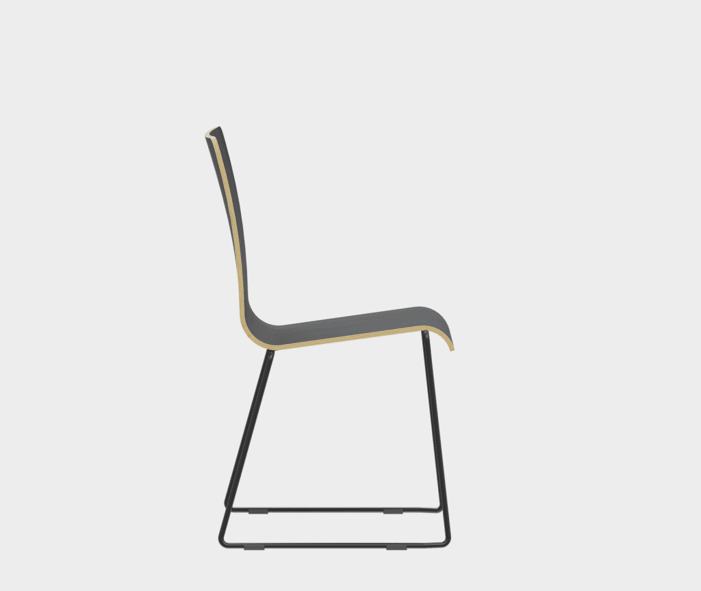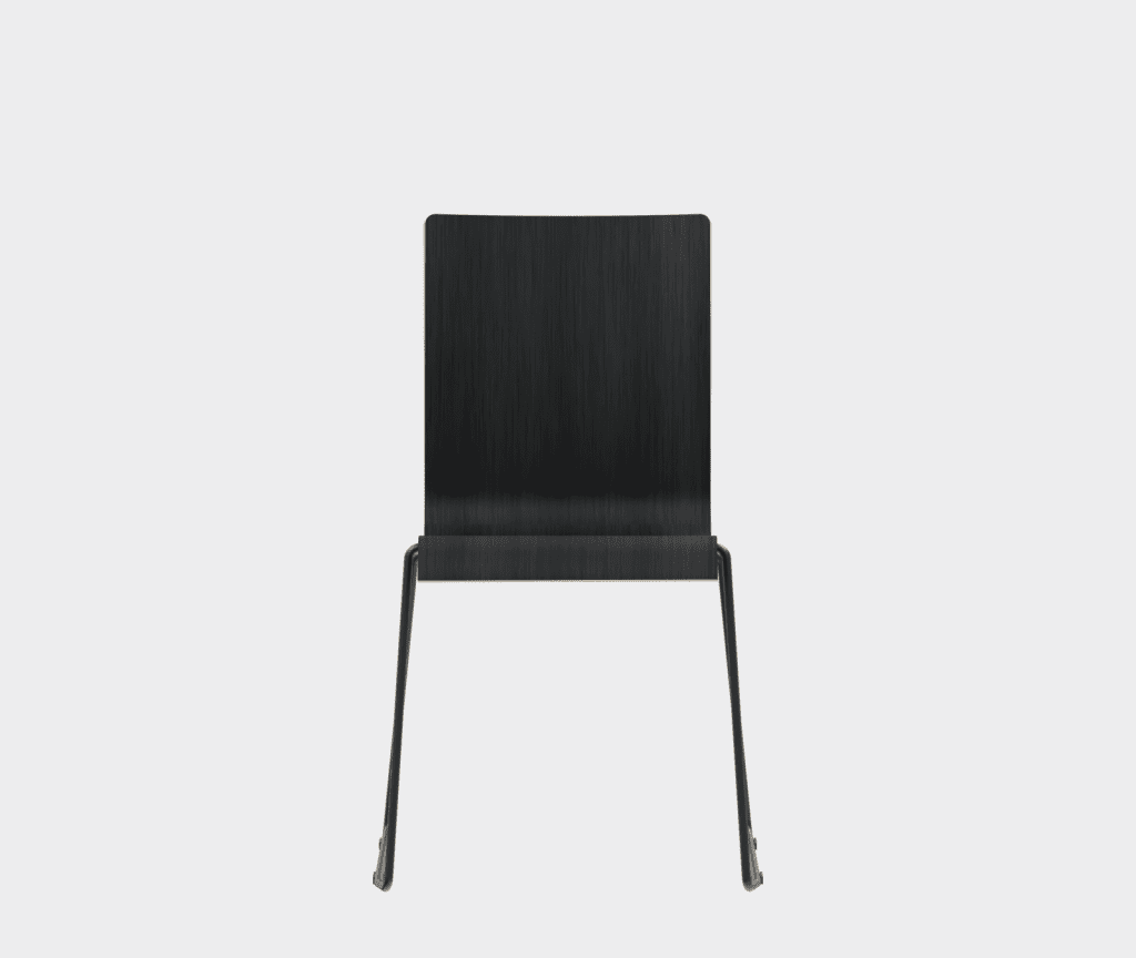 The chair is made of a moulded plywood monoblock with a trapezoidal steel frame.