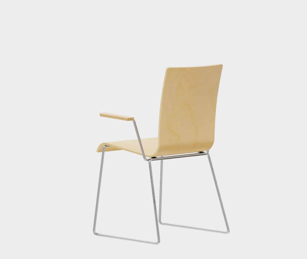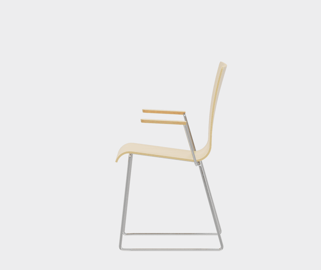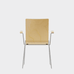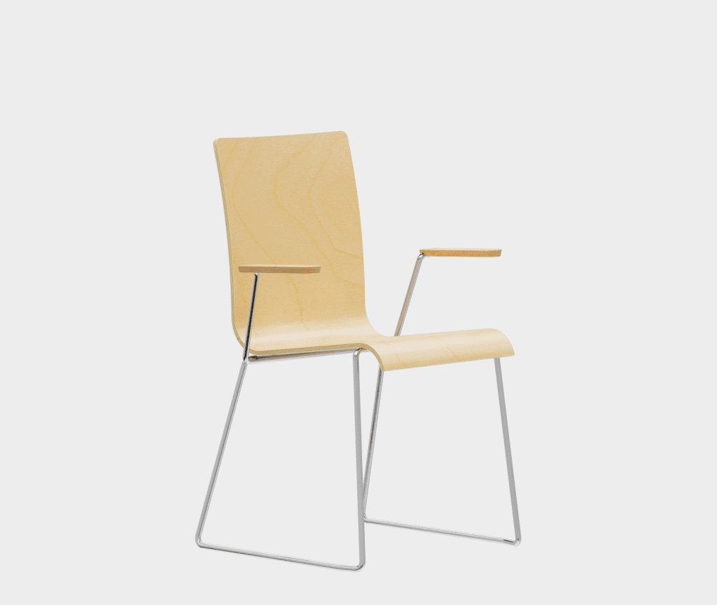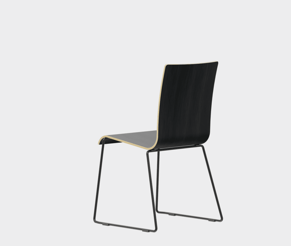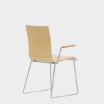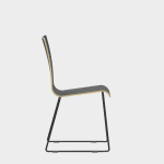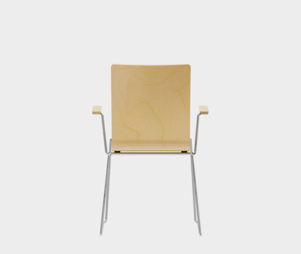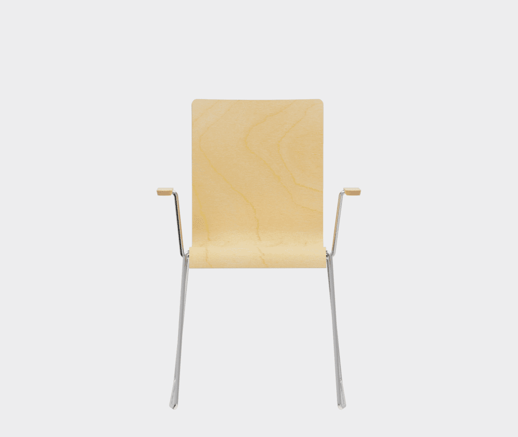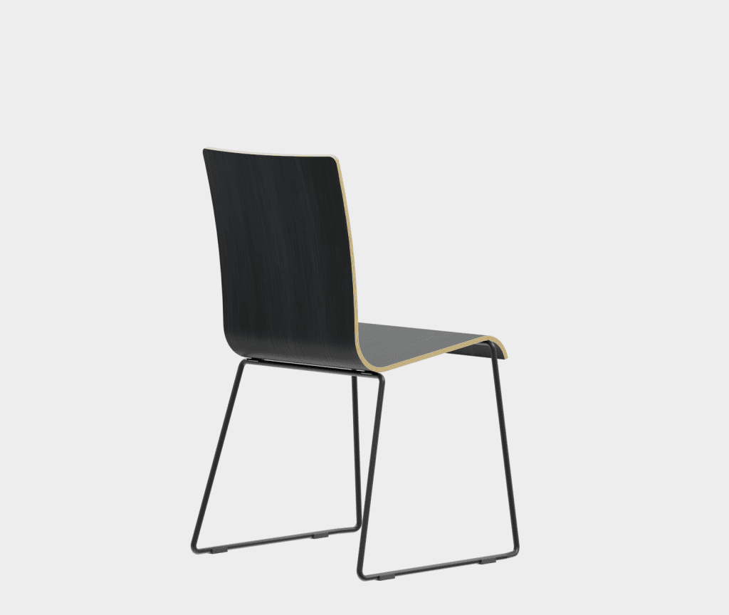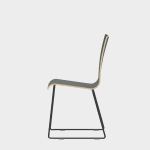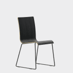 The chair is made of a moulded plywood monoblock with a trapezoidal steel frame.