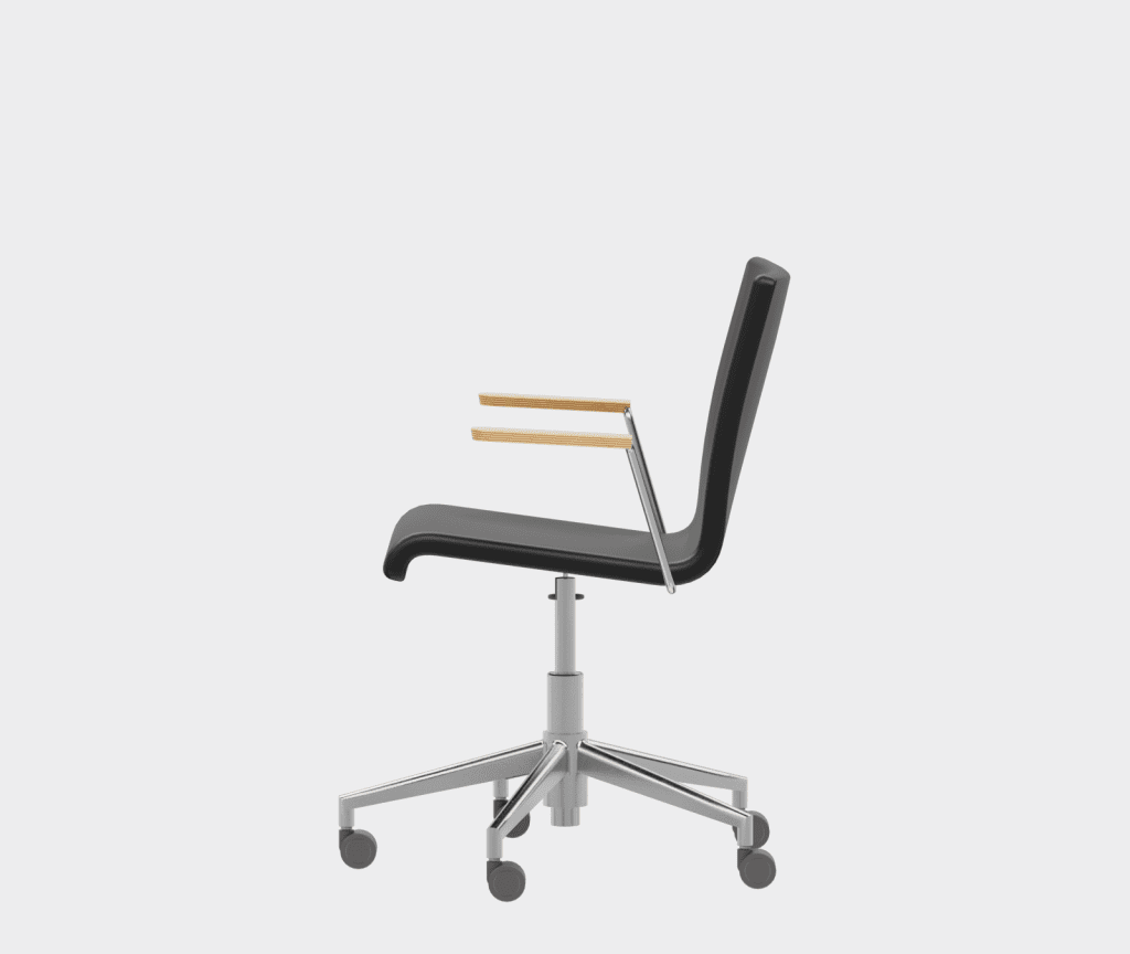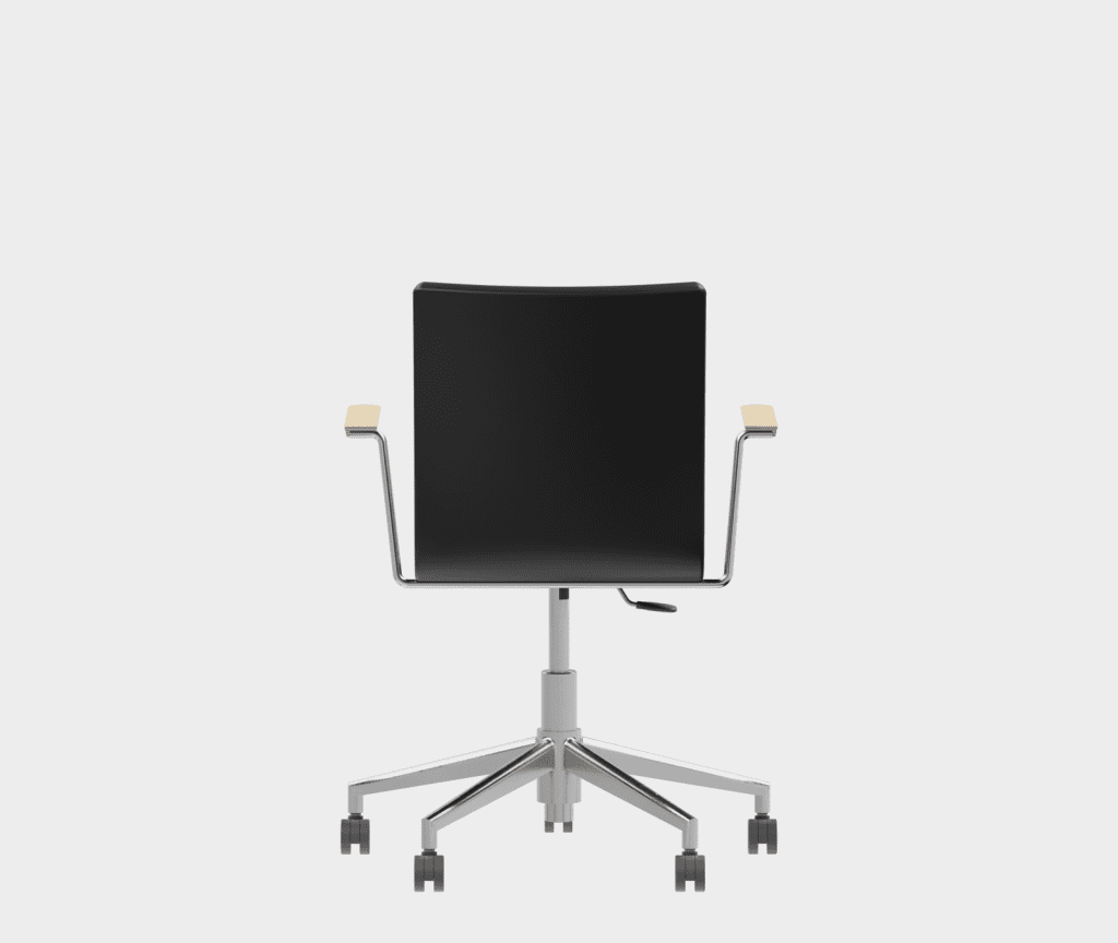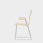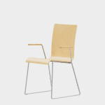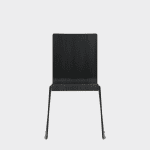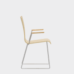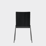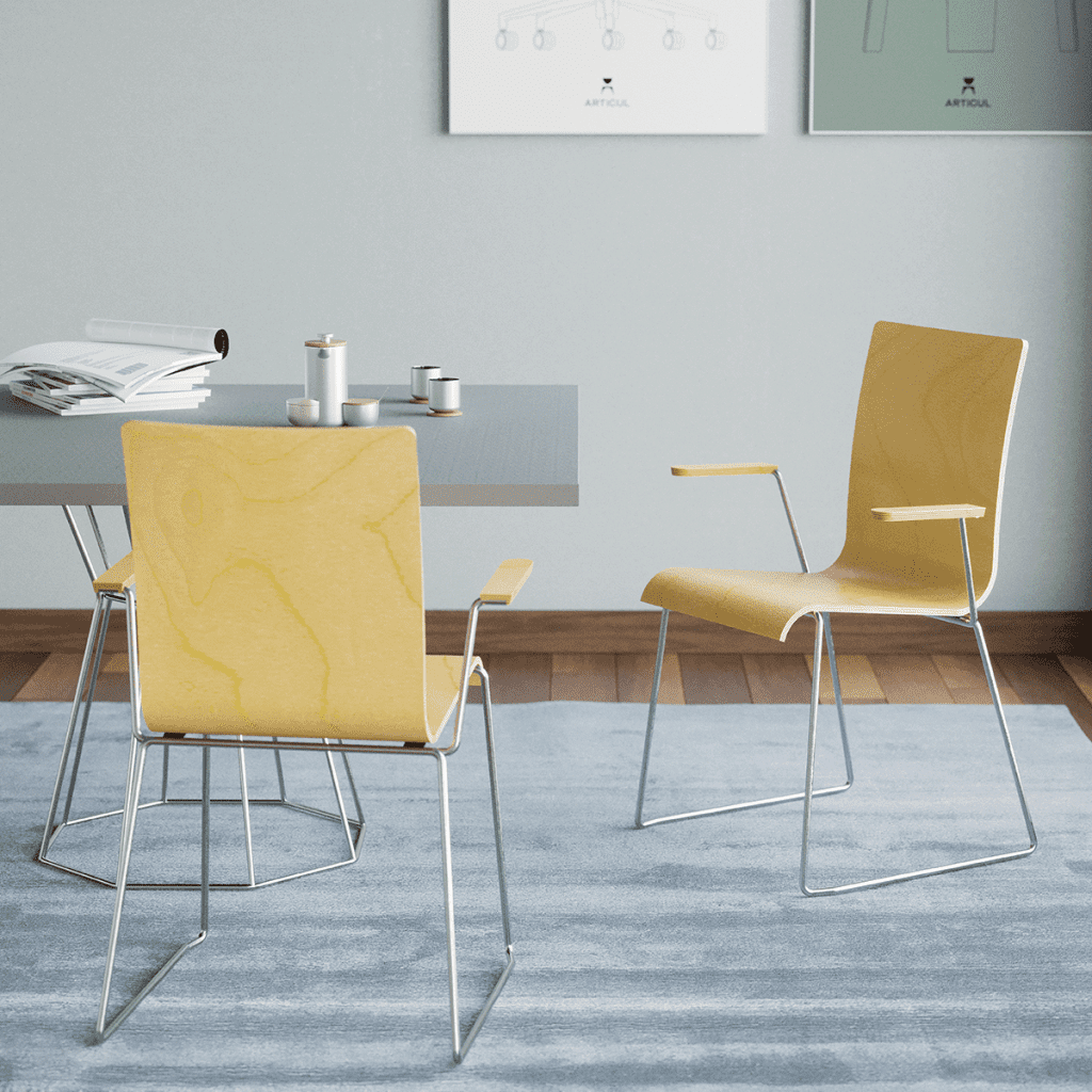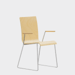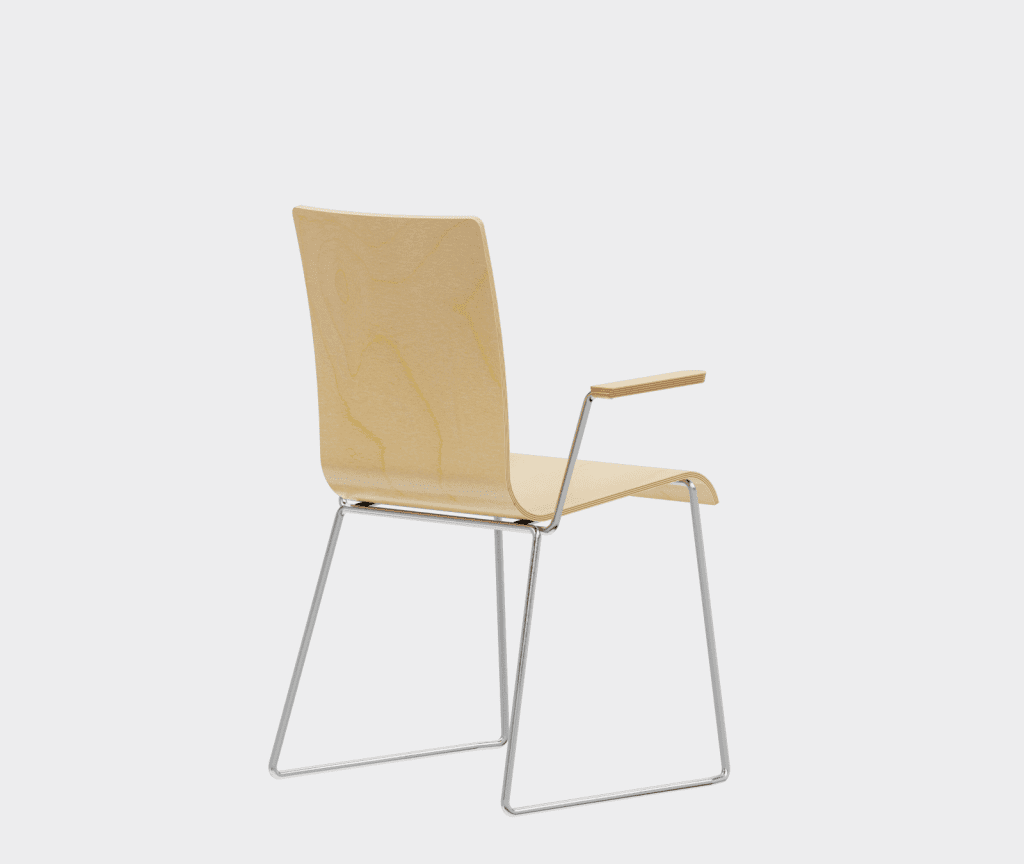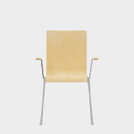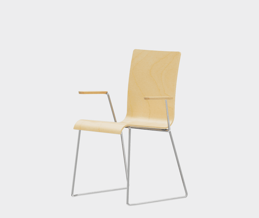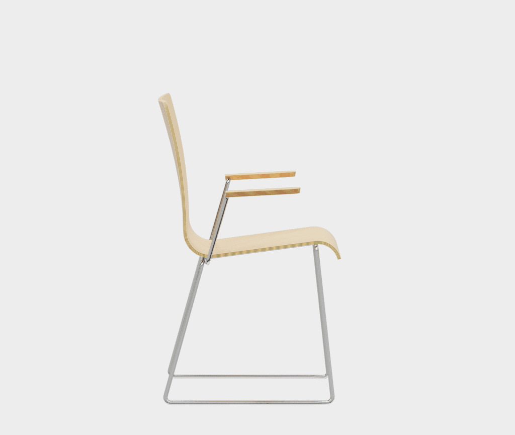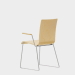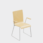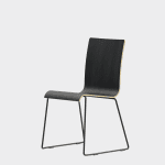 The chair is made of a moulded plywood monoblock with a trapezoidal steel frame.