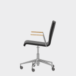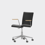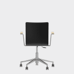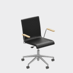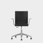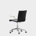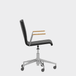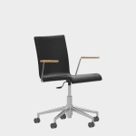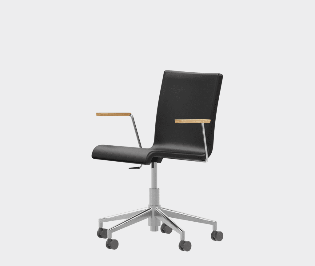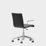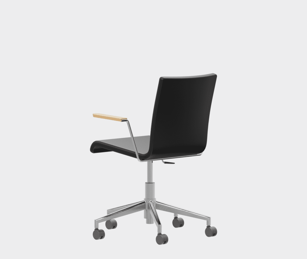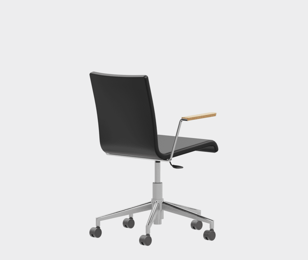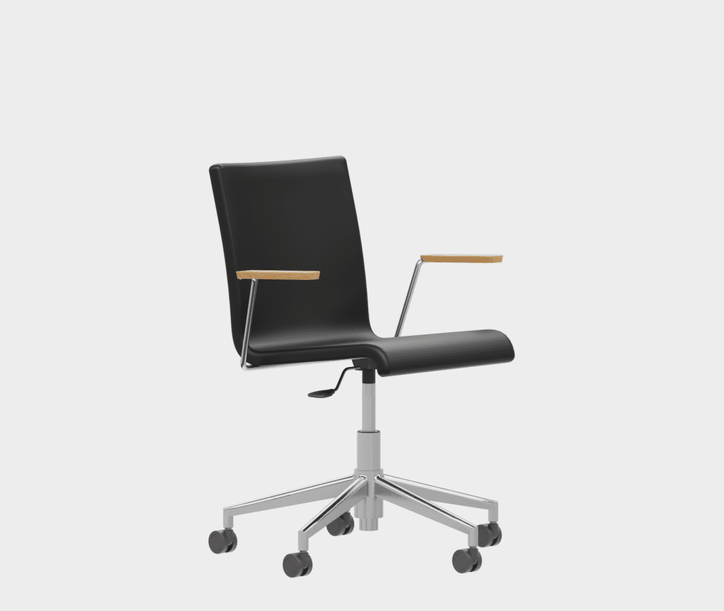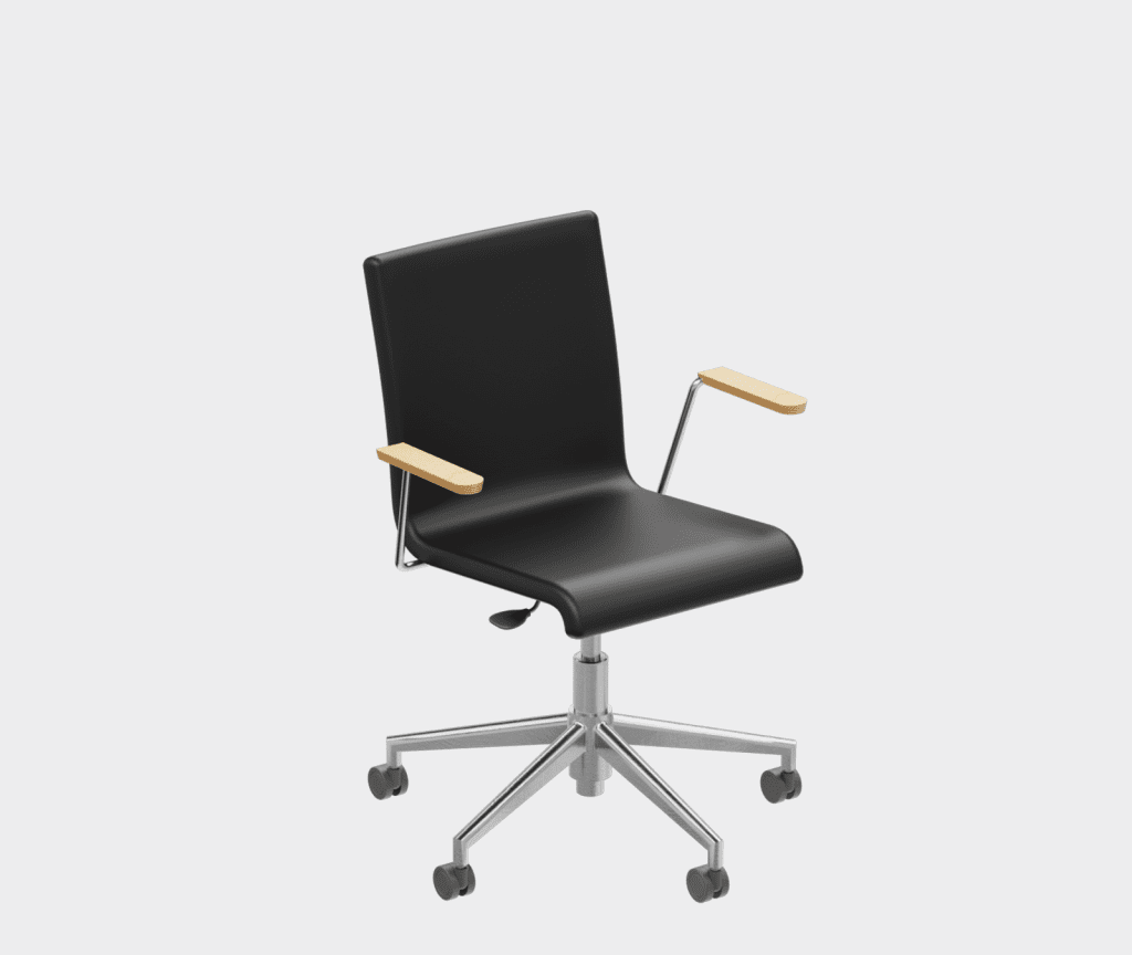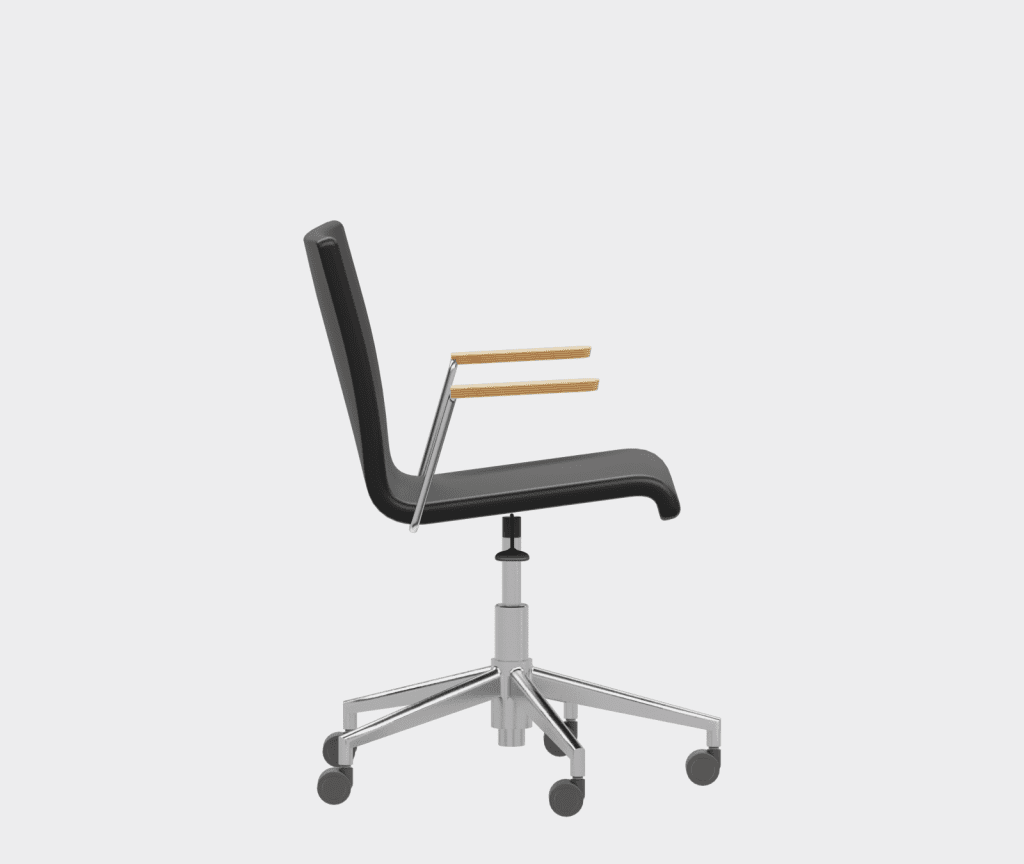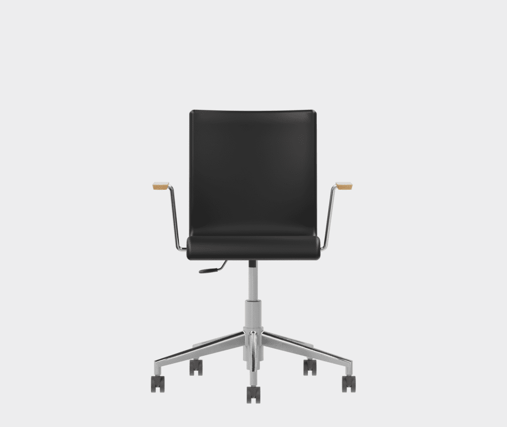 The chair is made of a moulded plywood monoblock with a trapezoidal steel frame.