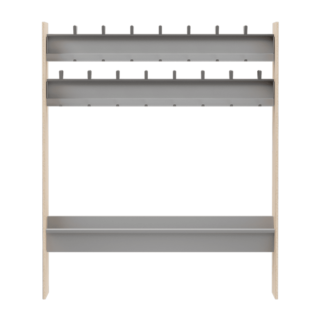 Tērauda rāmis ar stieni pakaramajiem, apavu plauktu un ekscentriskiem riteņiem vieglai pārvietošanai.